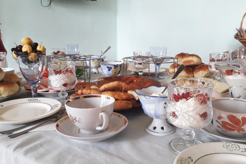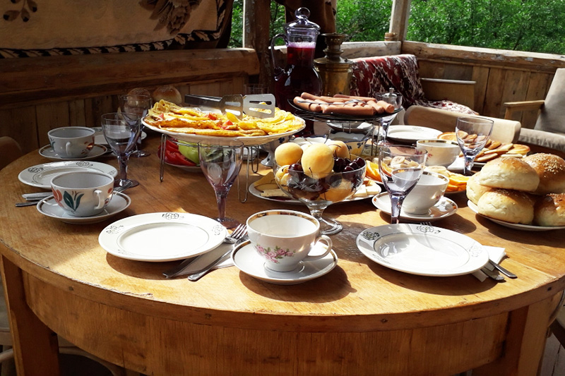 Հյուրերին առաջարկում ենք տեղական, էկոլոգիապես մաքուր սնունդ։ Տնական մուրաբաներ, Դիլիջանի հանդամասերից հավաքված, բուժիչ խոտաբույսերով թեյեր։ Թեյը մատուցում ենք 1860թ ինքնաեռով։